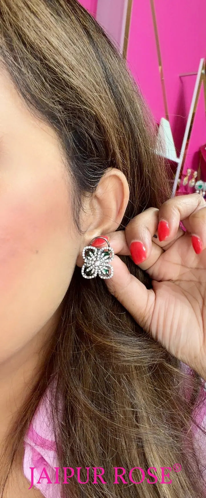 Safa Oxidized Silver With Emerald Green CZ Stud Earrings | Modern Indian Costume Jewellery by Jaipur Rose
