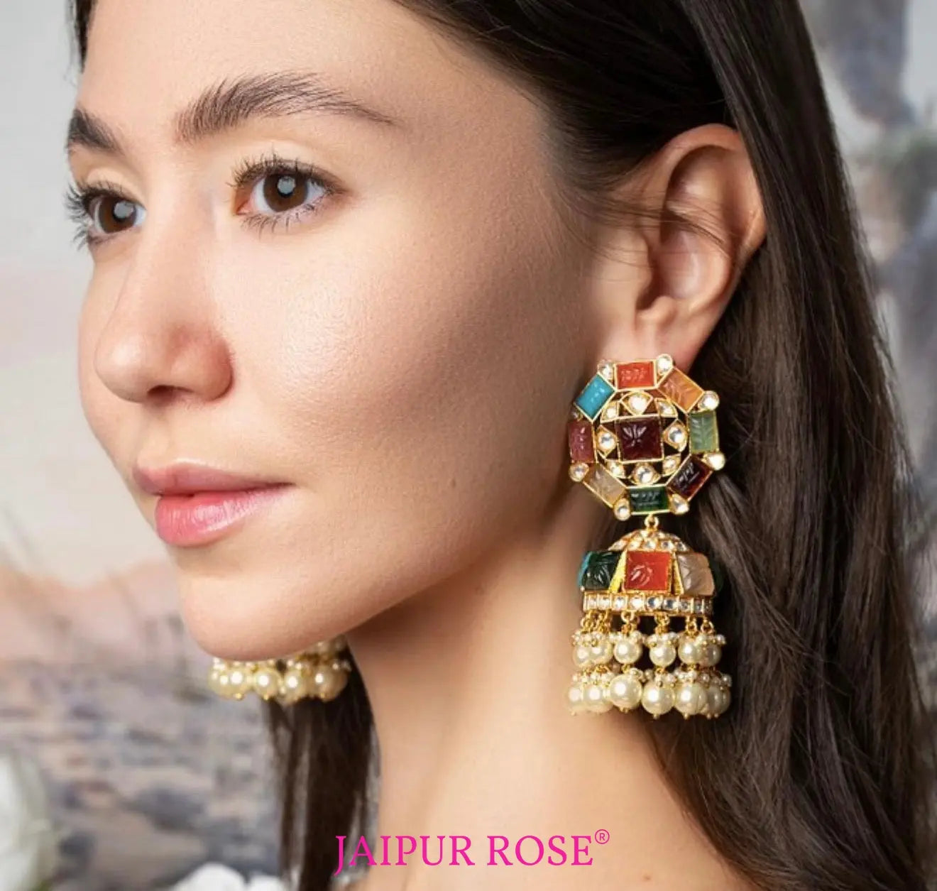 Navratna Gem Jhumkas | Jaipur Rose Indian Jewelry Store USA