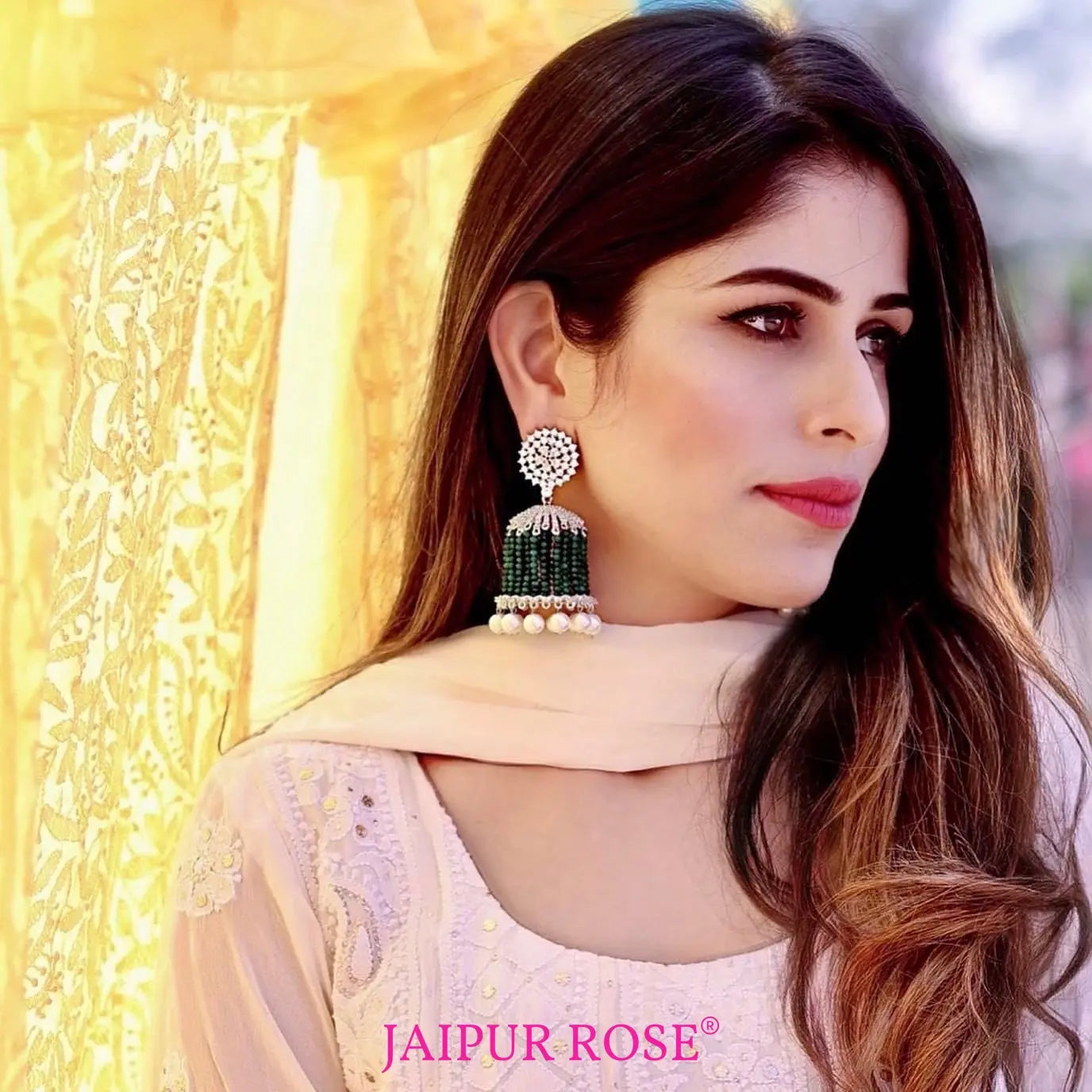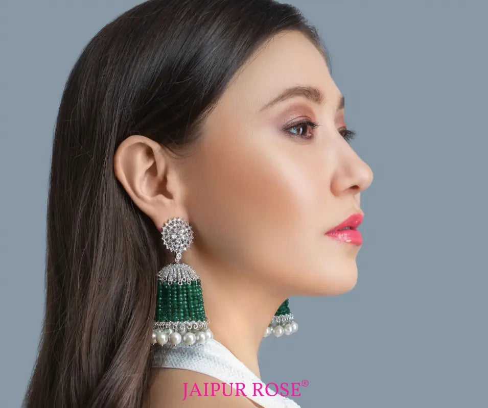 Bipasha Emerald Green Beaded Jhumkas | Jaipur Rose Indian Jewelry Store USA