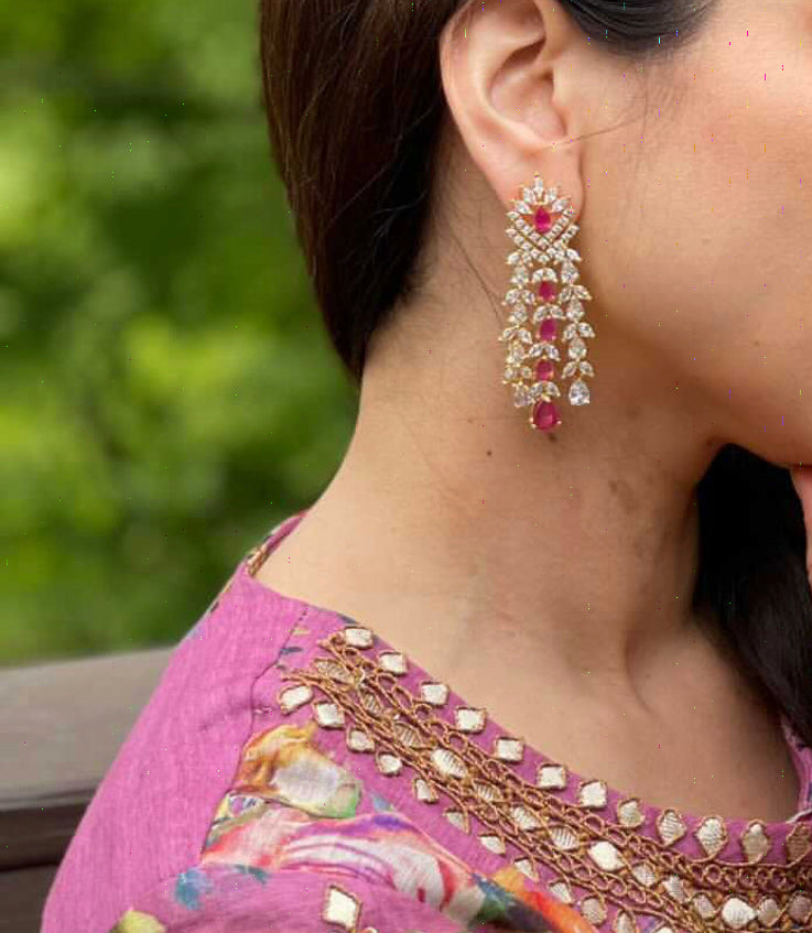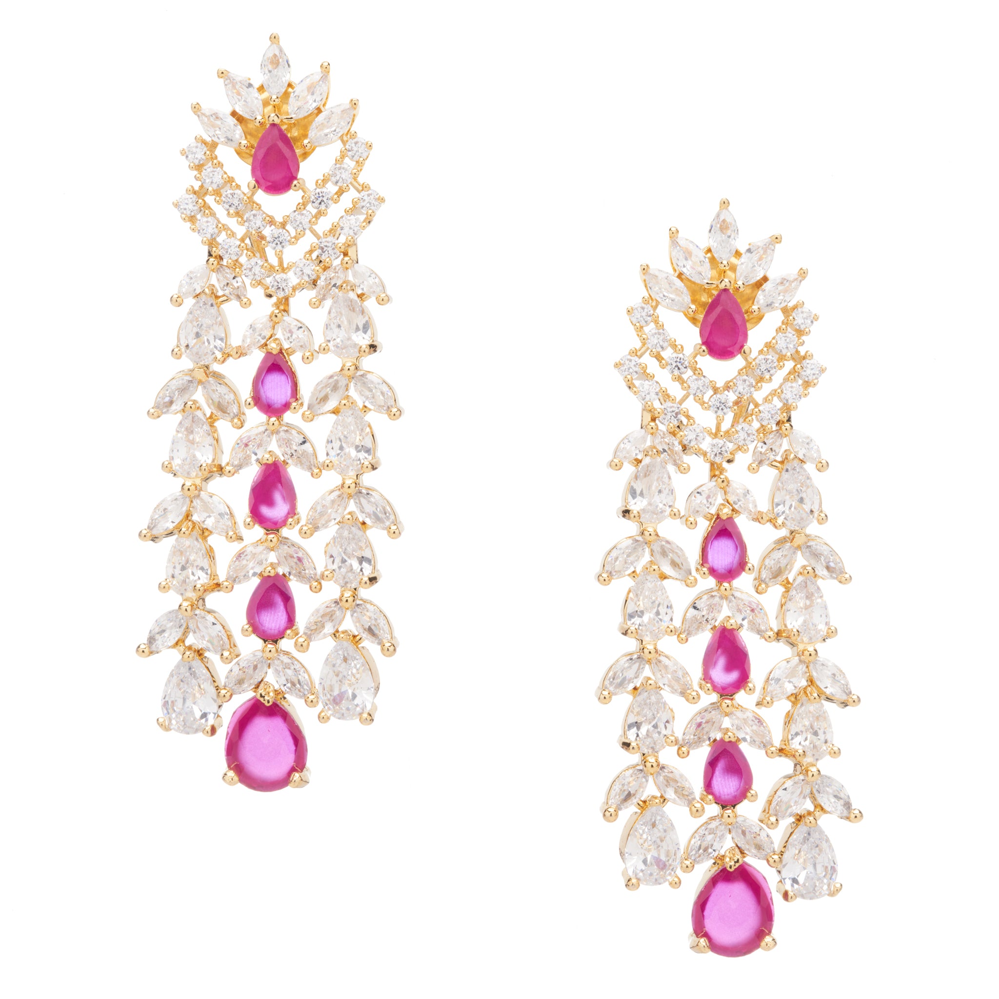 Ava Two Toned Yellow Gold Plated & Ruby Red CZ Earrings | Designer Costume Jewelry By Jaipur Rose