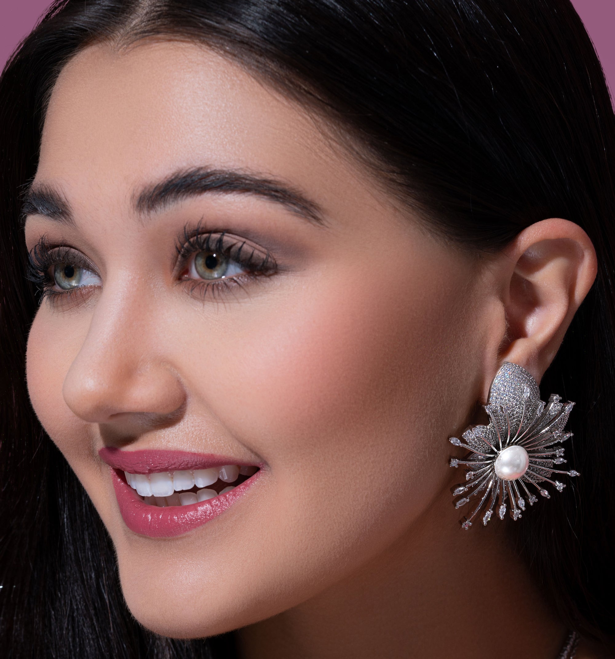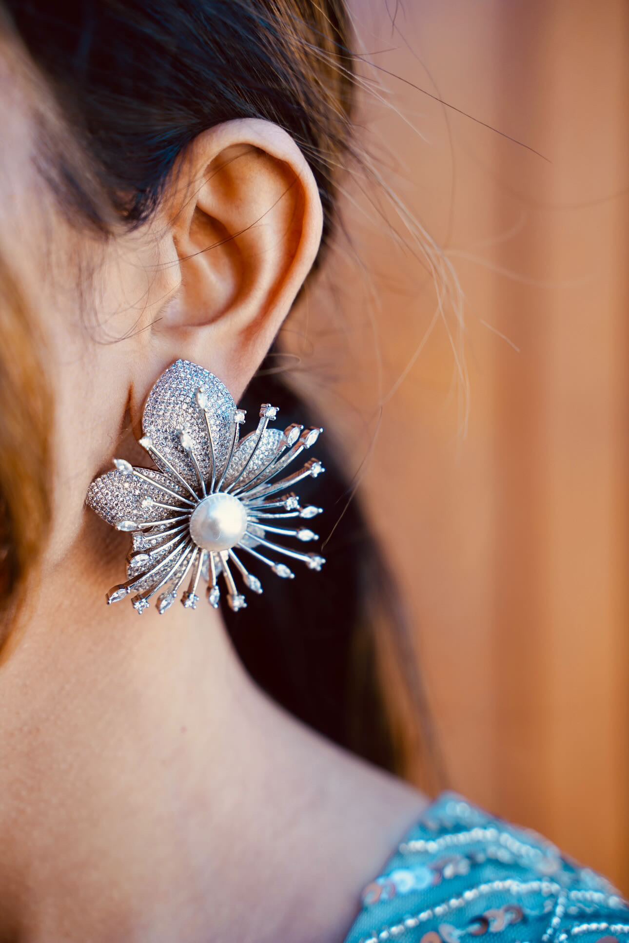Blythe White Gold Plated White Stones Pearl Statement Stud Earrings | Modern Desi Jewelry By Jaipur Rose